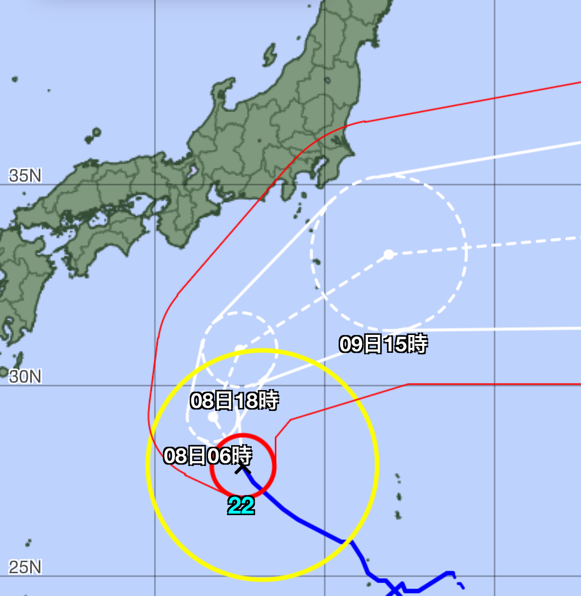 非常に強い台風22号は、8日(水)午前0時現在、日本の南にあって、時速15キロで北西へ進んでいます。