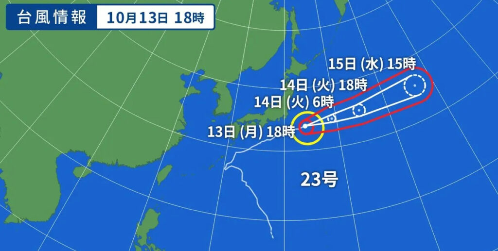 強い台風23号は、13日(月)午後6時現在、関東の南東にあって、時速35キロで東へ進んでいます。